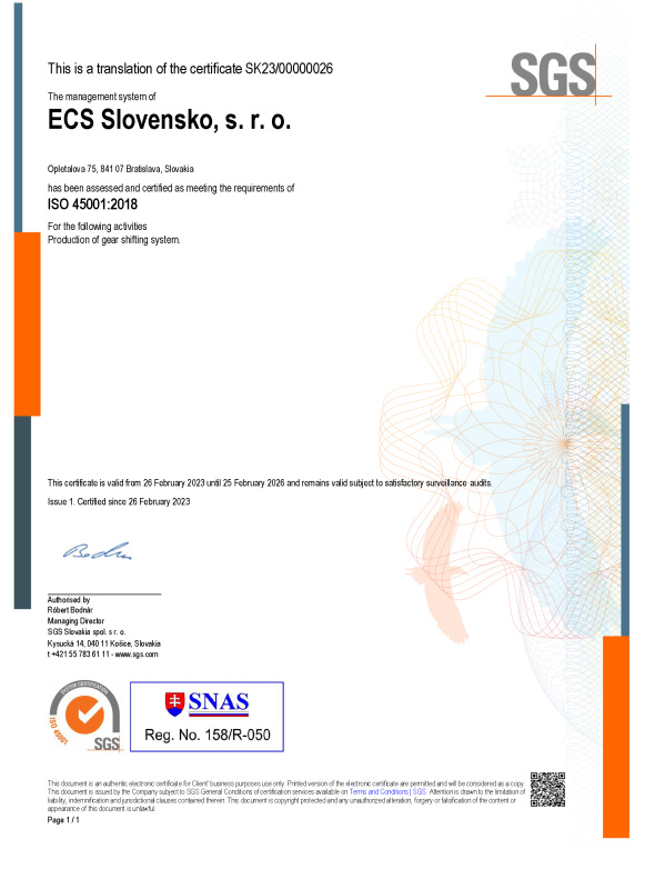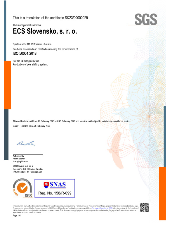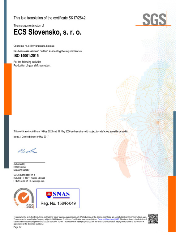 Certificate for Environmental Management System - ECS Slovensko
